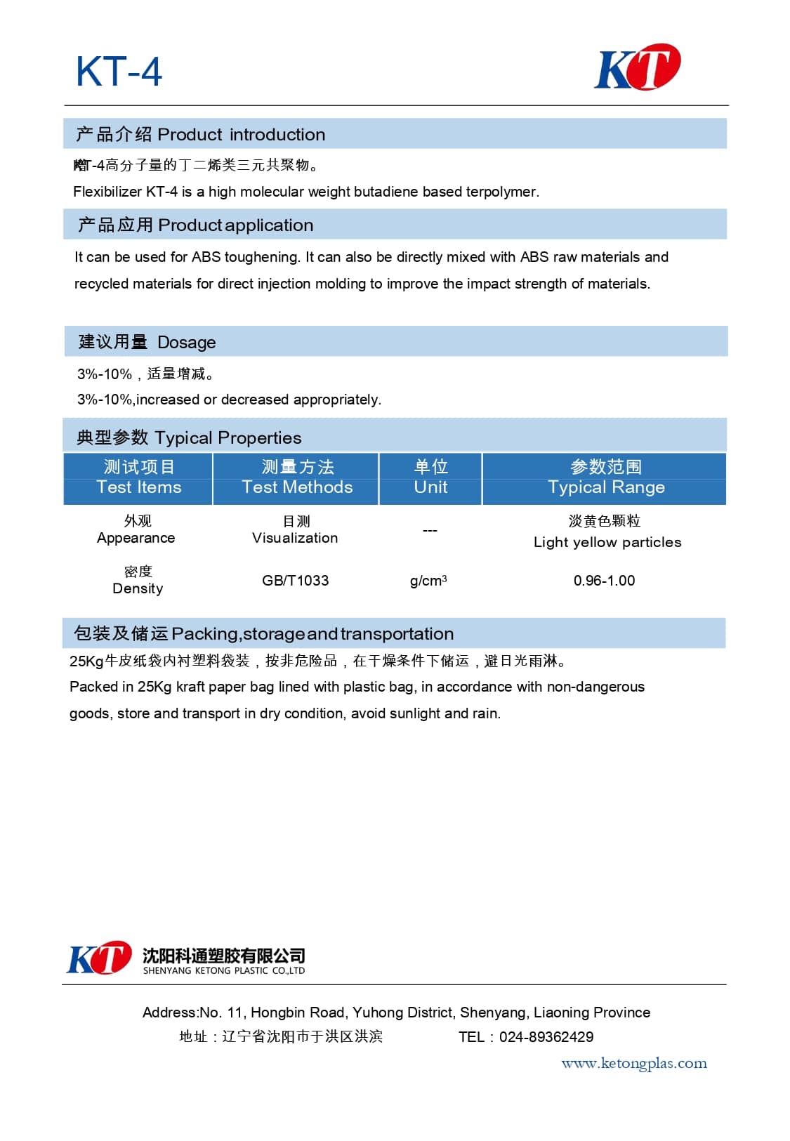 • Flexibilizer KT-4: Heightening ABS ToughnessIntroducing Flexibilizer KT-4, a high molecular weight butadiene-based terpolymer, engineered to significantly enhance ABS (Acrylonitrile Butadiene Styrene) toughness. This cutting-edge product stands out in the polymer industry for its efficiency and versatility.Key Benefits of Flexibilizer KT-4: